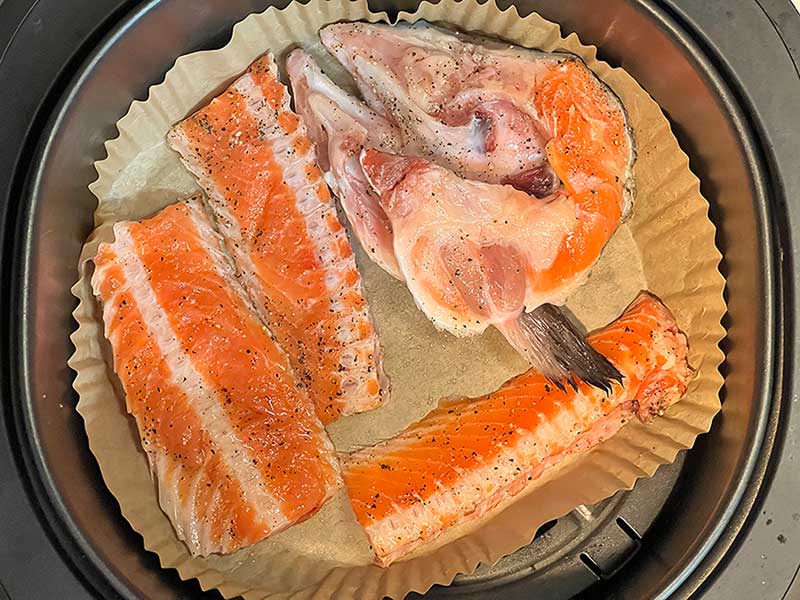 에어프라이기 메뉴에 생선 굽는 세팅이 있으면 선택하시고 없으면 180도에 20분 돌려주세요. 창 사이로 한 번씩 체크해 주세요. 연어의 기름이 엄청 빠져나올 거예요. 종이 포일을 사용하시면 설거지 걱정을 줄입니다.